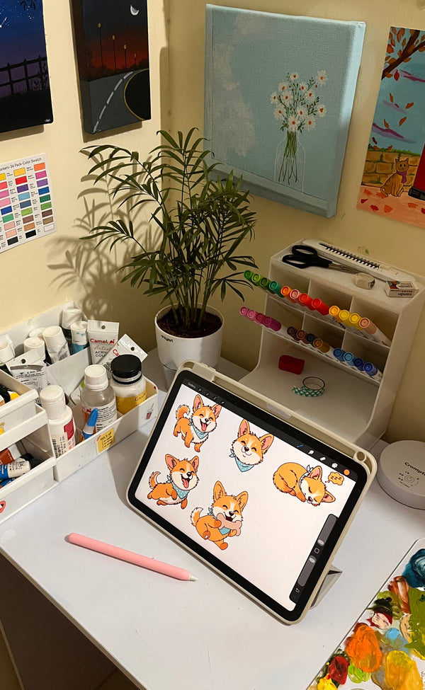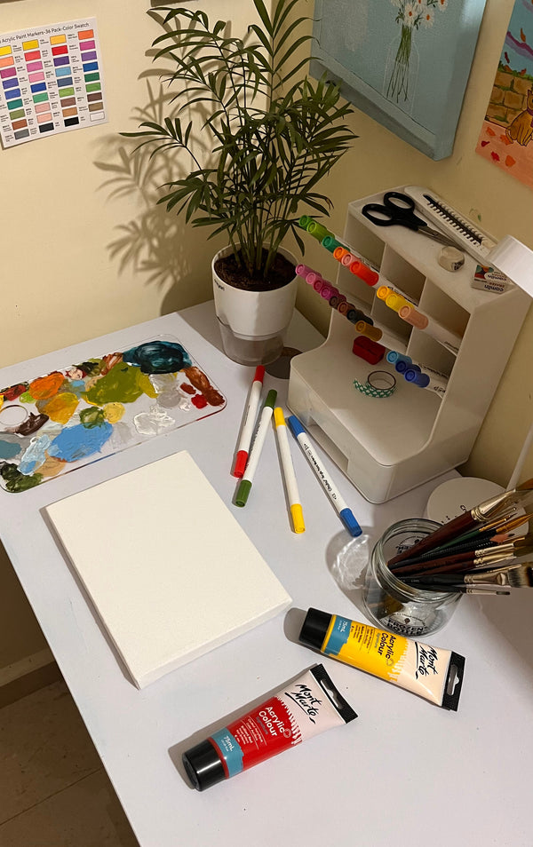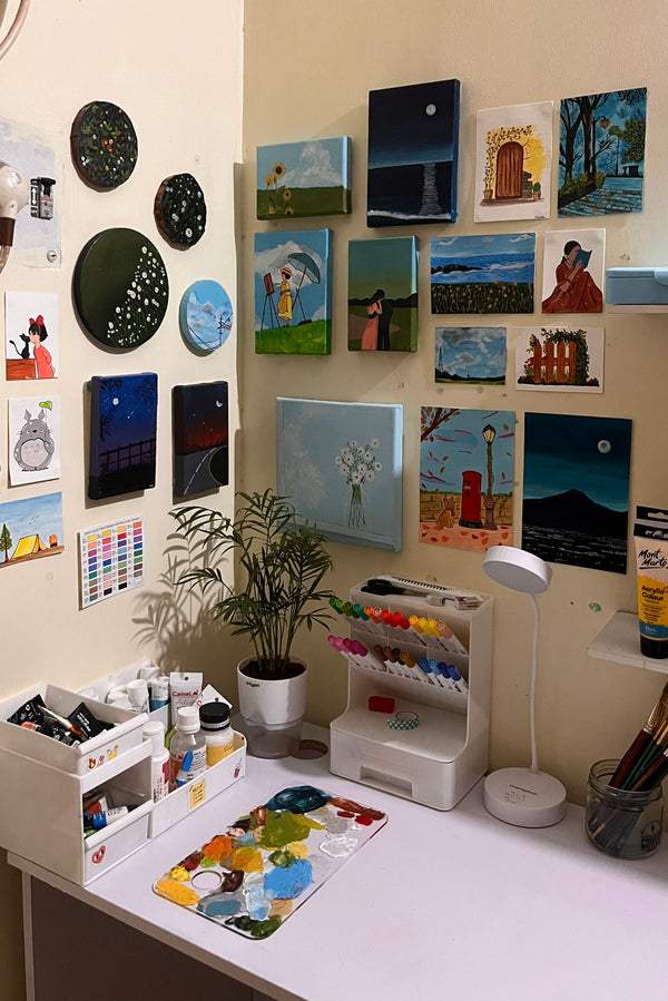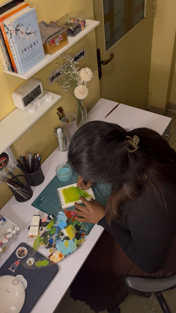 Hi, I'm Navina, I’ve been creating art for a little over a year, mostly in acrylics at first. Recently I’ve been exploring watercolours and gouache, and I love how each medium shifts my mood and pace in a different way.